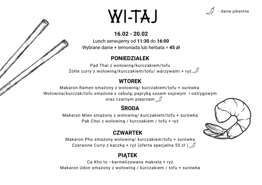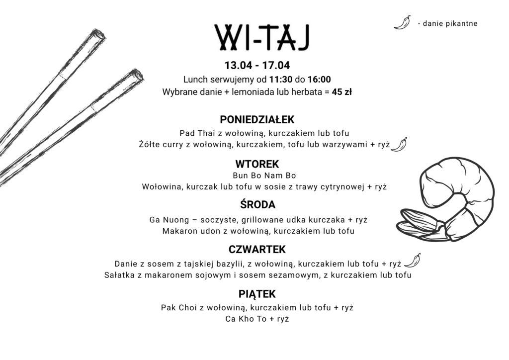 Od poniedziałku do piątku w restauracji Wi-Taj w Warszawie oferujemy lunch menu. Znajdziesz w nim ciekawe propozycje obiadowe z lemoniadą lub herbatą za 45 zł! Dzięki niemu możesz zjeść szybko i smacznie!