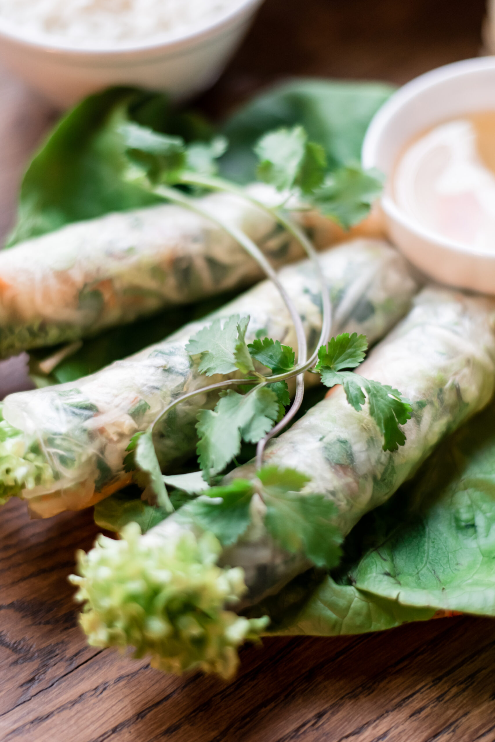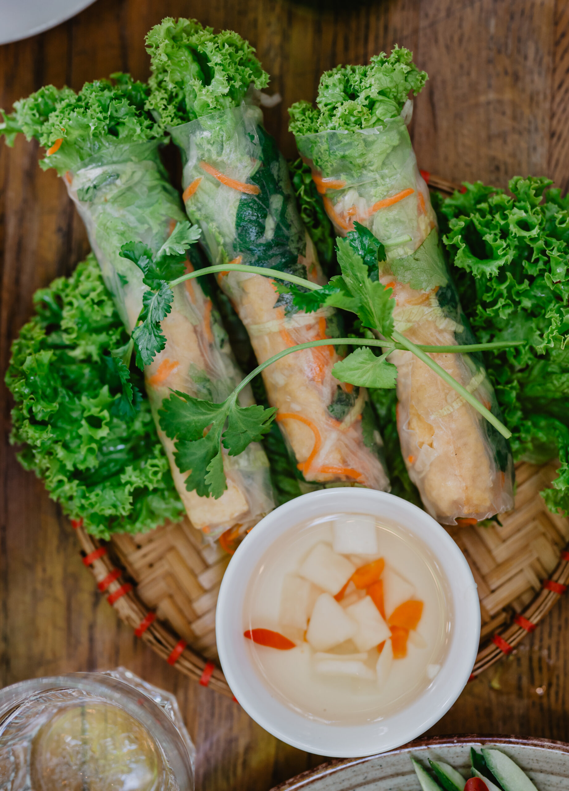 wietnamskie zioła i smażone tofu zawinięte w papier ryżowy.