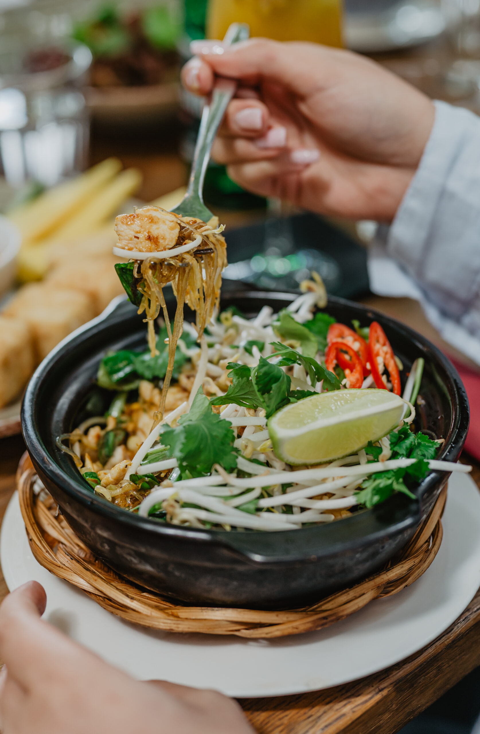 Makaron ryżowy smażony z wybranym dodatkiem, jajkiem, tofu, kiełkami i kolendrą,
