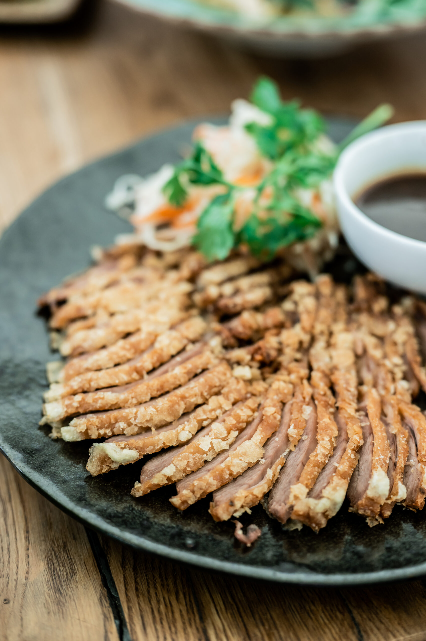Crispy skinned boneless Tonkin duck sprinkled with anise, cinnamon, clove and sichuan pepper served with