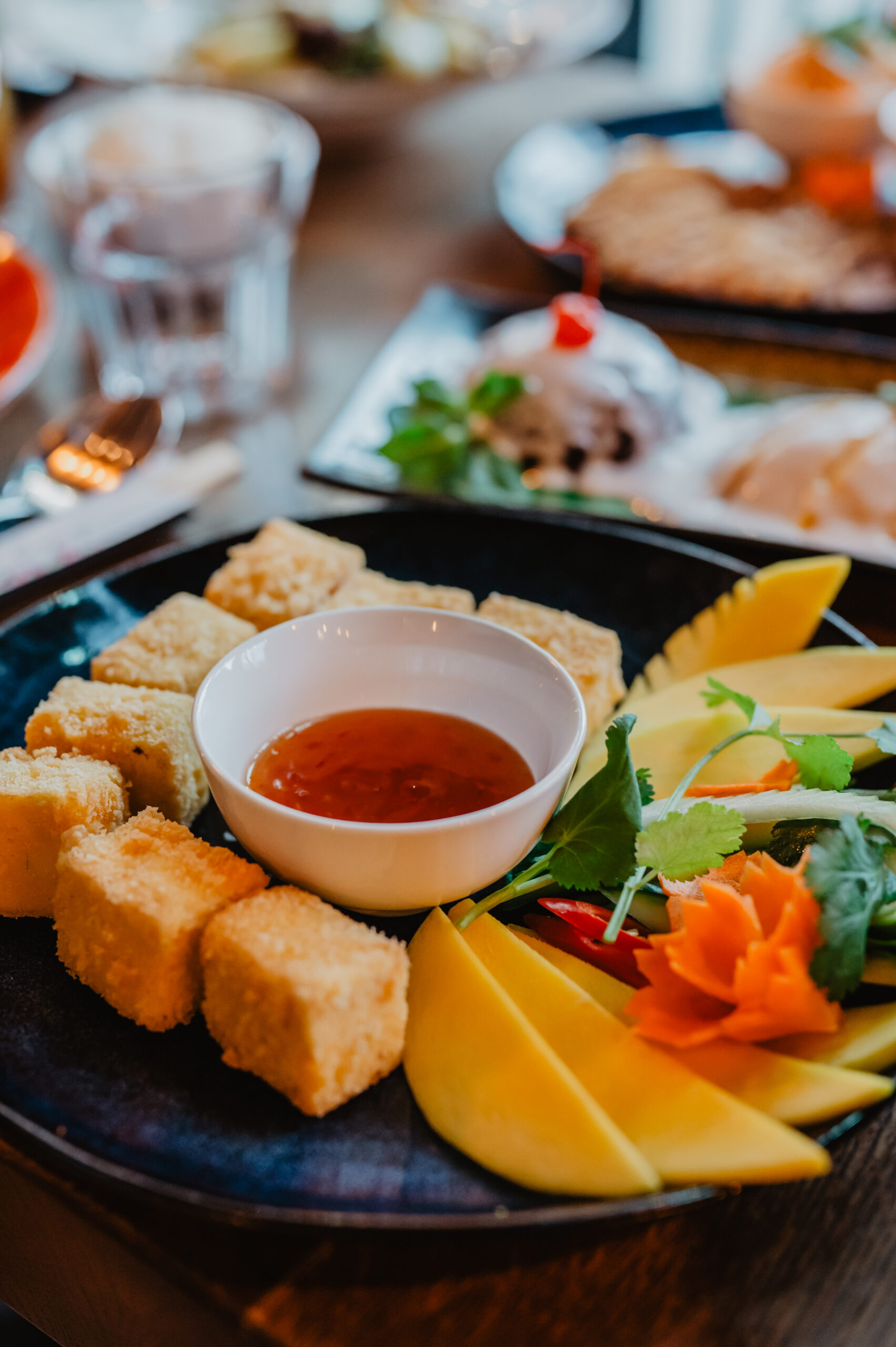 Fresh tofu deep fried in crispy coating served with sweet and sour sauce and pieces of fresh pineapple.