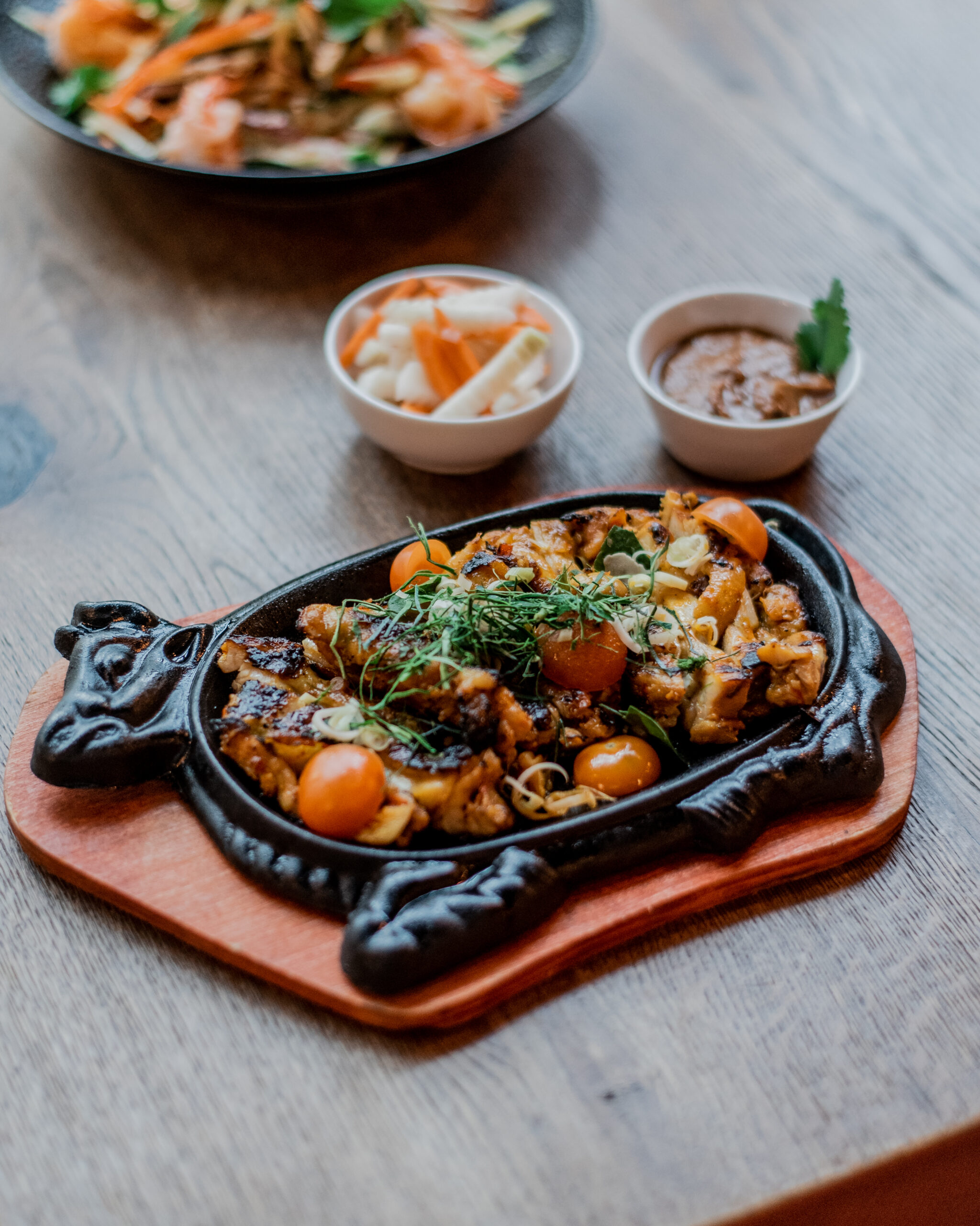 Grilled chicken thighs marinated in chilli, lemongrass, shallots and keffir leaves. The dish is served with the chef's oryginal sauce.
