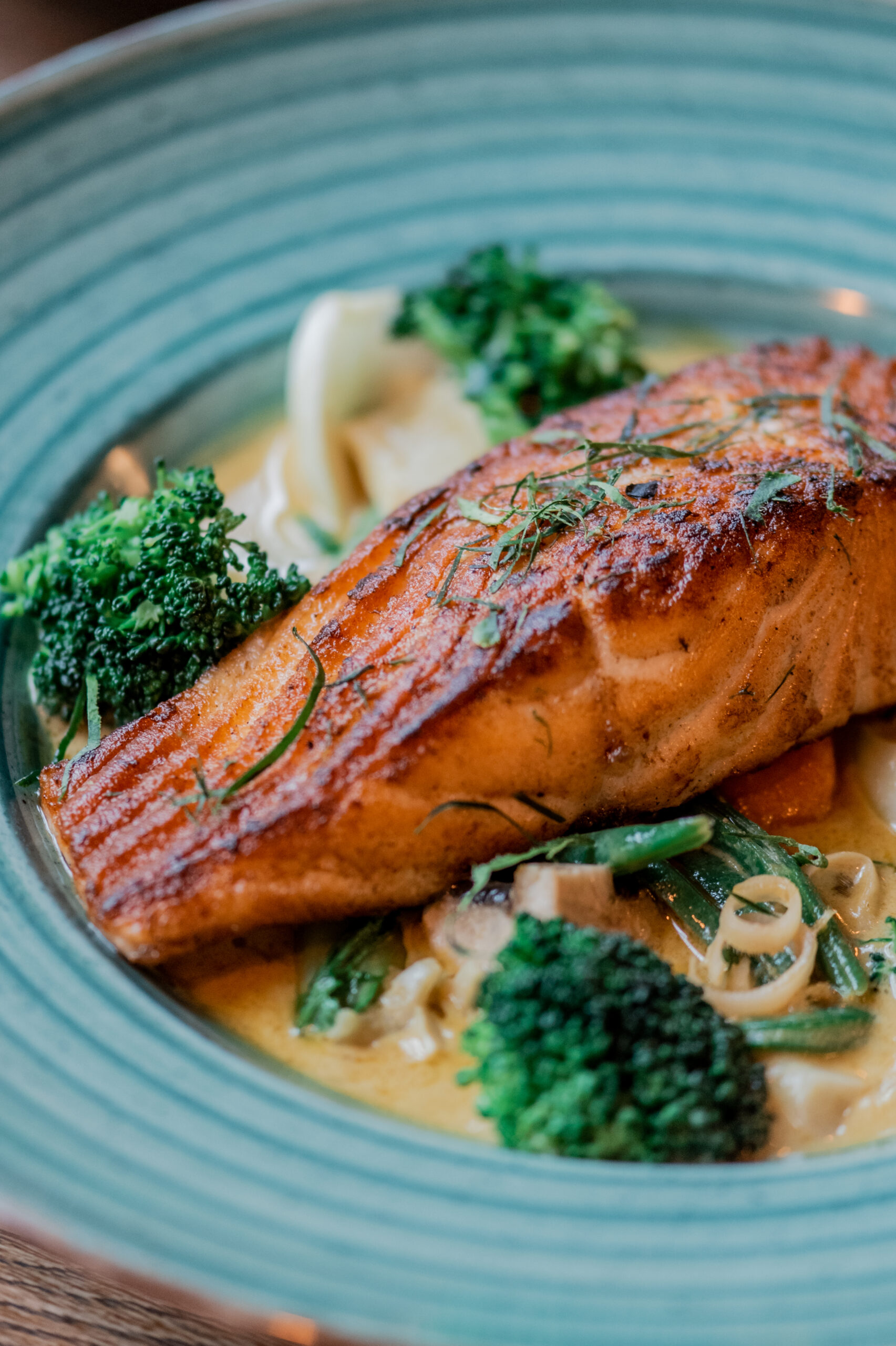 Soczyste grillowane udka kurczaka marynowane w chilli, trawie cytrynowej z dodatkiem szalotki i liści kafiru. Danie podane z autorskim sosem szefa kuchni.