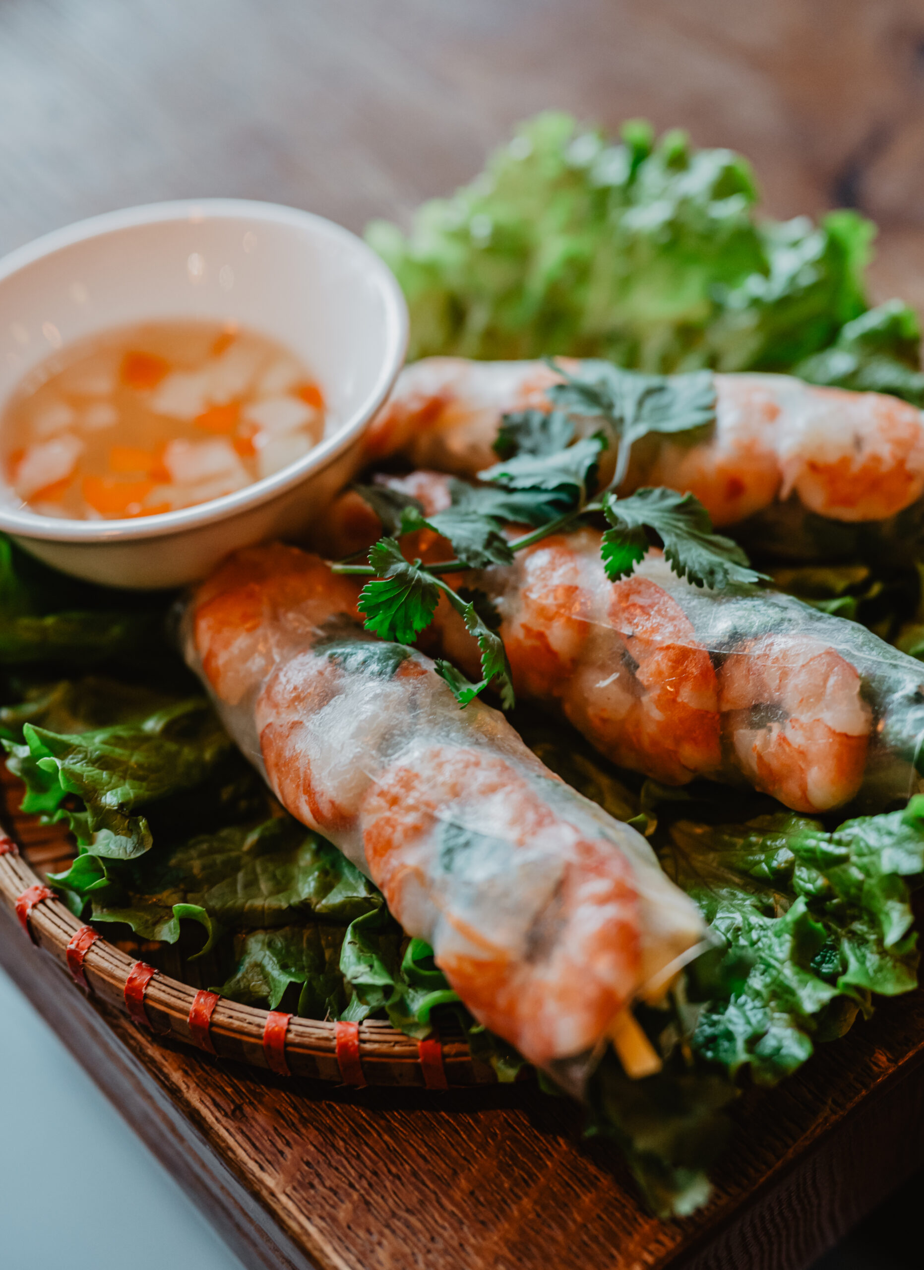 boczek, kolendra, wietnamskie zioła i krewetki black tiger zawinięte w papier ryżowy.