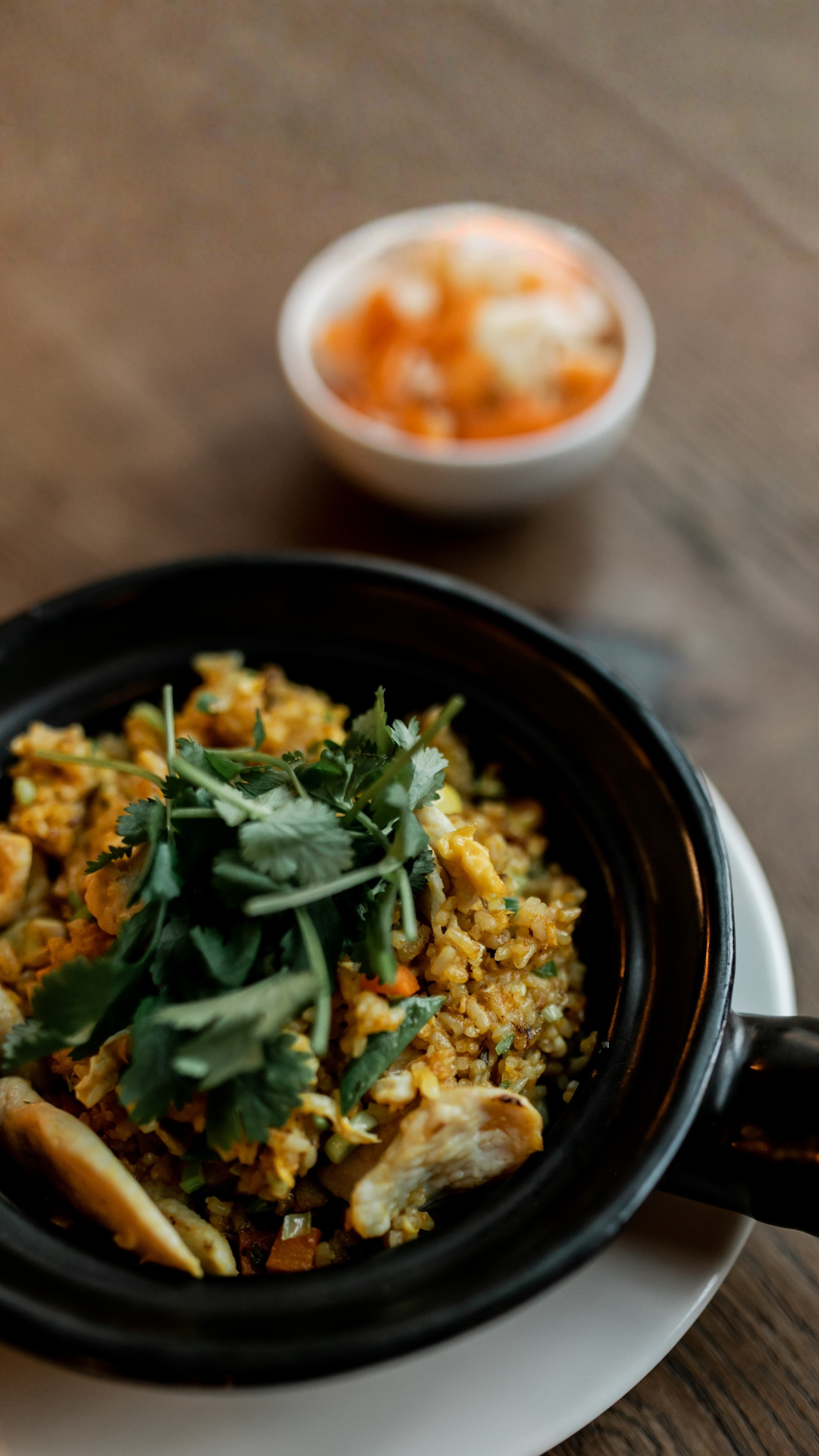 i grzybami na bazie sosu rybnego zapiekany w ceglanym garnuszku, podany z marynowaną marchewką i kalarepą.