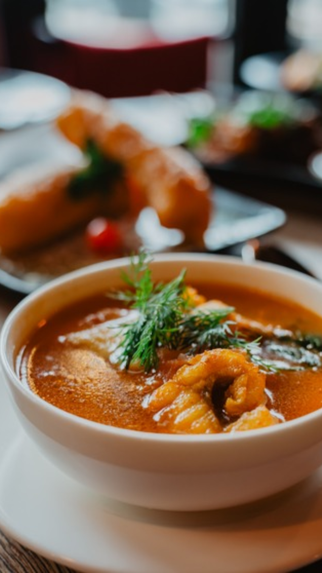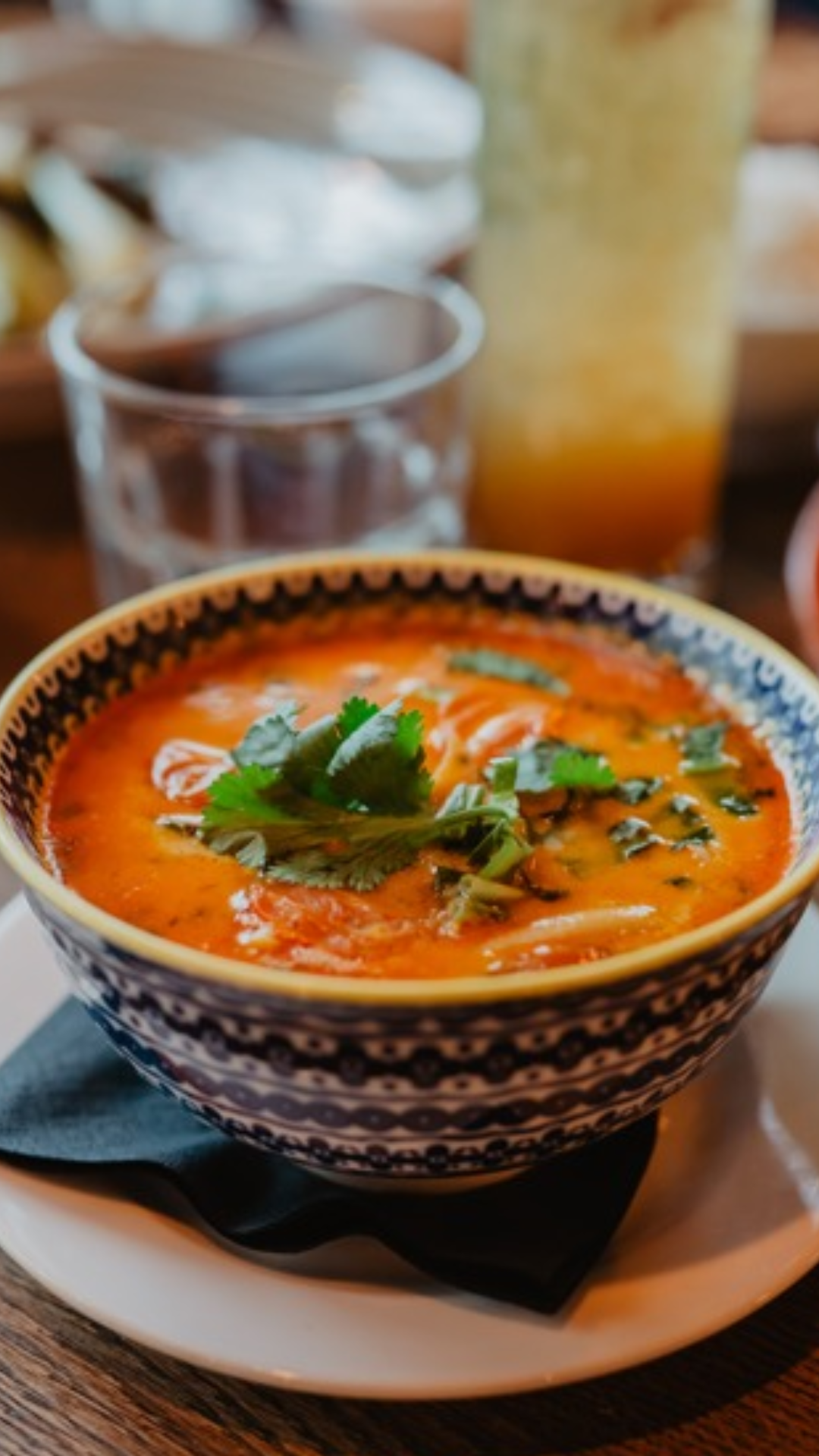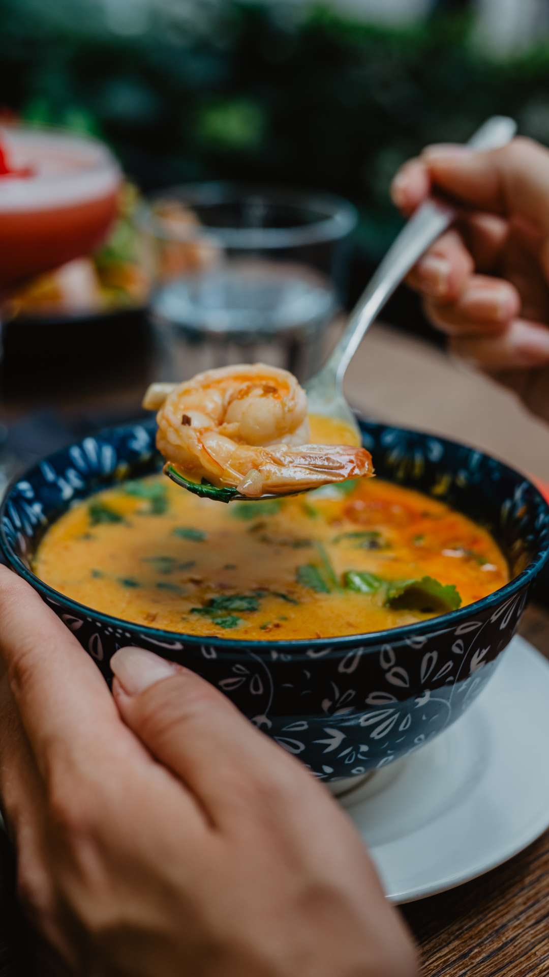 Tajska zupa ostro-kwaśna z mlekiem kokosowym, krewetkami black tiger / kurczakiem / tofu, pomidorami, shimeji, galangą, trawą cytrynową, świeżą kolendrą i liściem kafiru