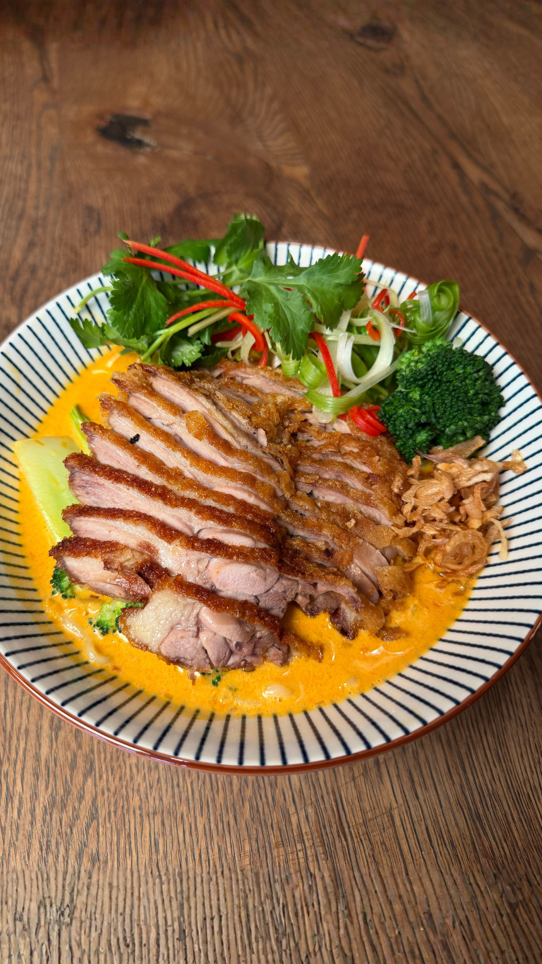 Thai yellow/red/green curry with chosen add-on, bamboo, brocoli, scallion, green bean, carrot, pack choi and mushrooms.